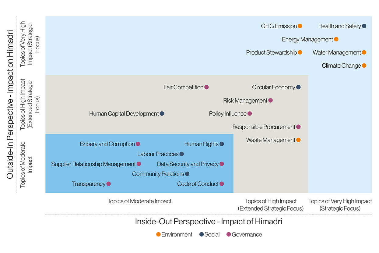 SEBI framework: The Business Responsibility and Sustainability Report (BRSR), introduced by SEBI, is India’s sustainability disclosure framework promoting corporate transparency. For Himadri, it serves as both a compliance tool and a strategic enabler, aligning with GRI, TCFD, and UN SDGs to provide global stakeholders with a transparent, data-driven view of our ESG performance. It bridges national compliance with global standards, underscoring our commitment to responsible growth and sustainable value creation.